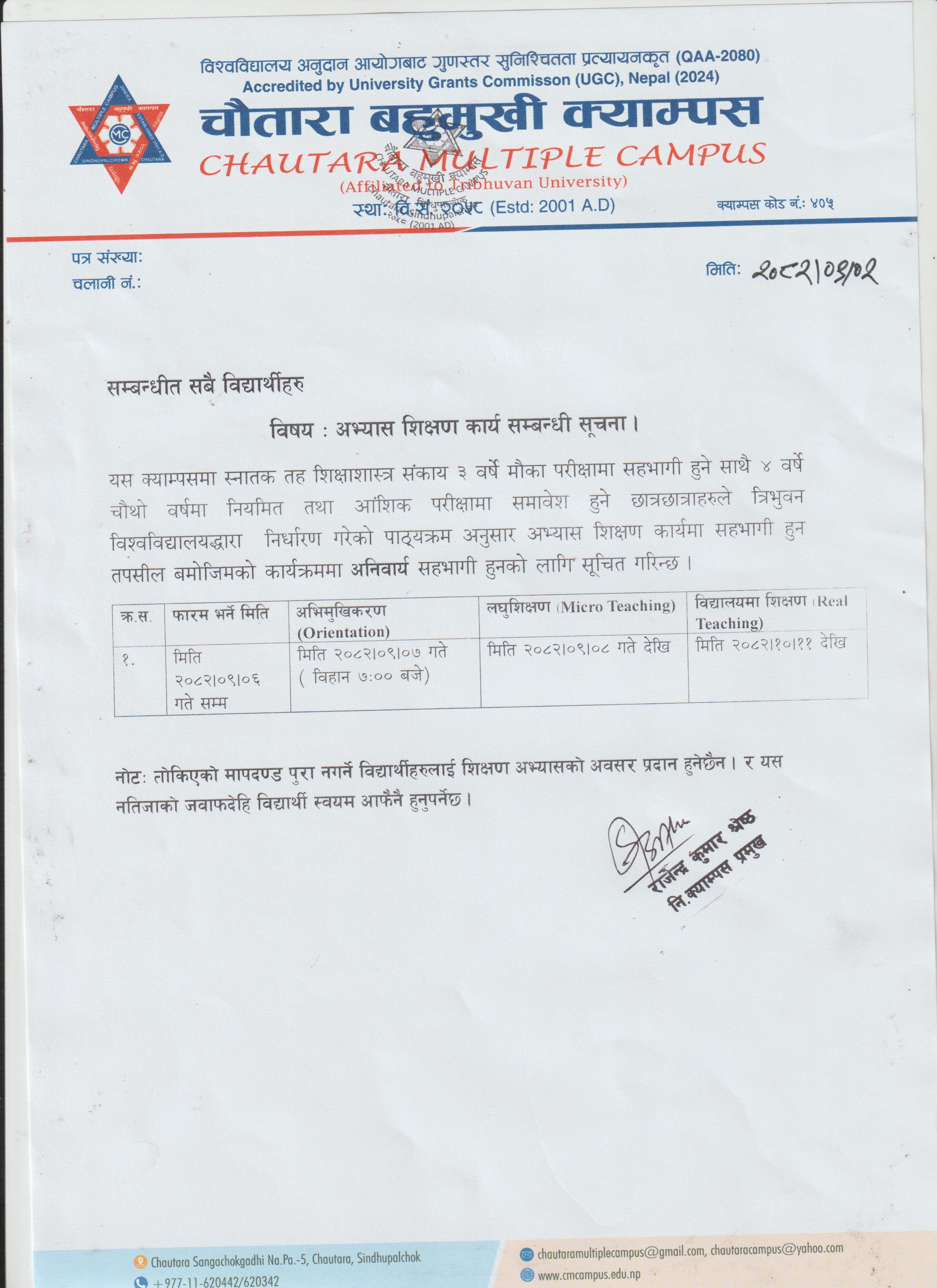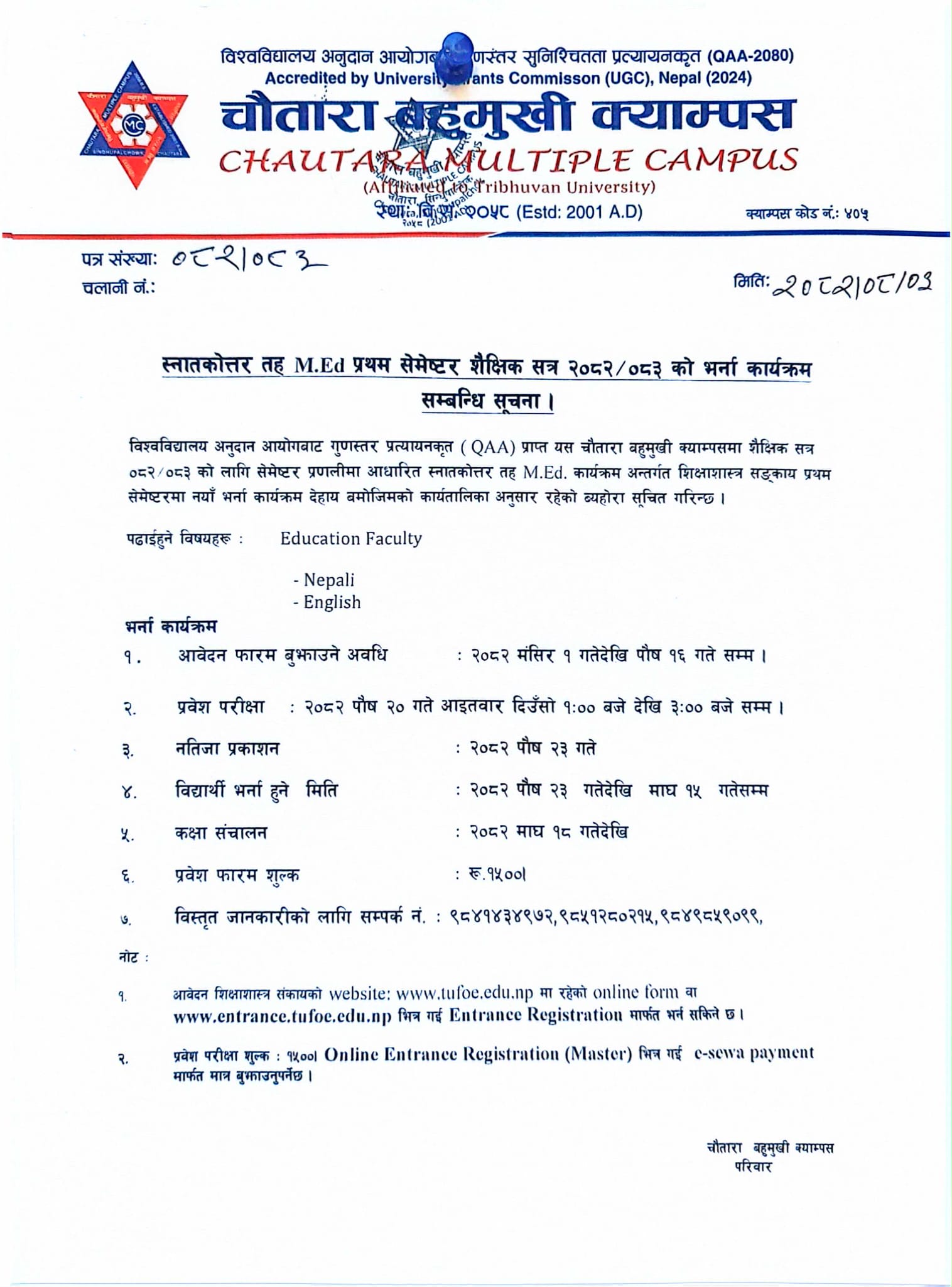 | स्नातकोत्तर तह एम.एड. प्रथम सेमेष्टर ०८२/०८३ को भर्ना सम्बन्धी सूचना । |