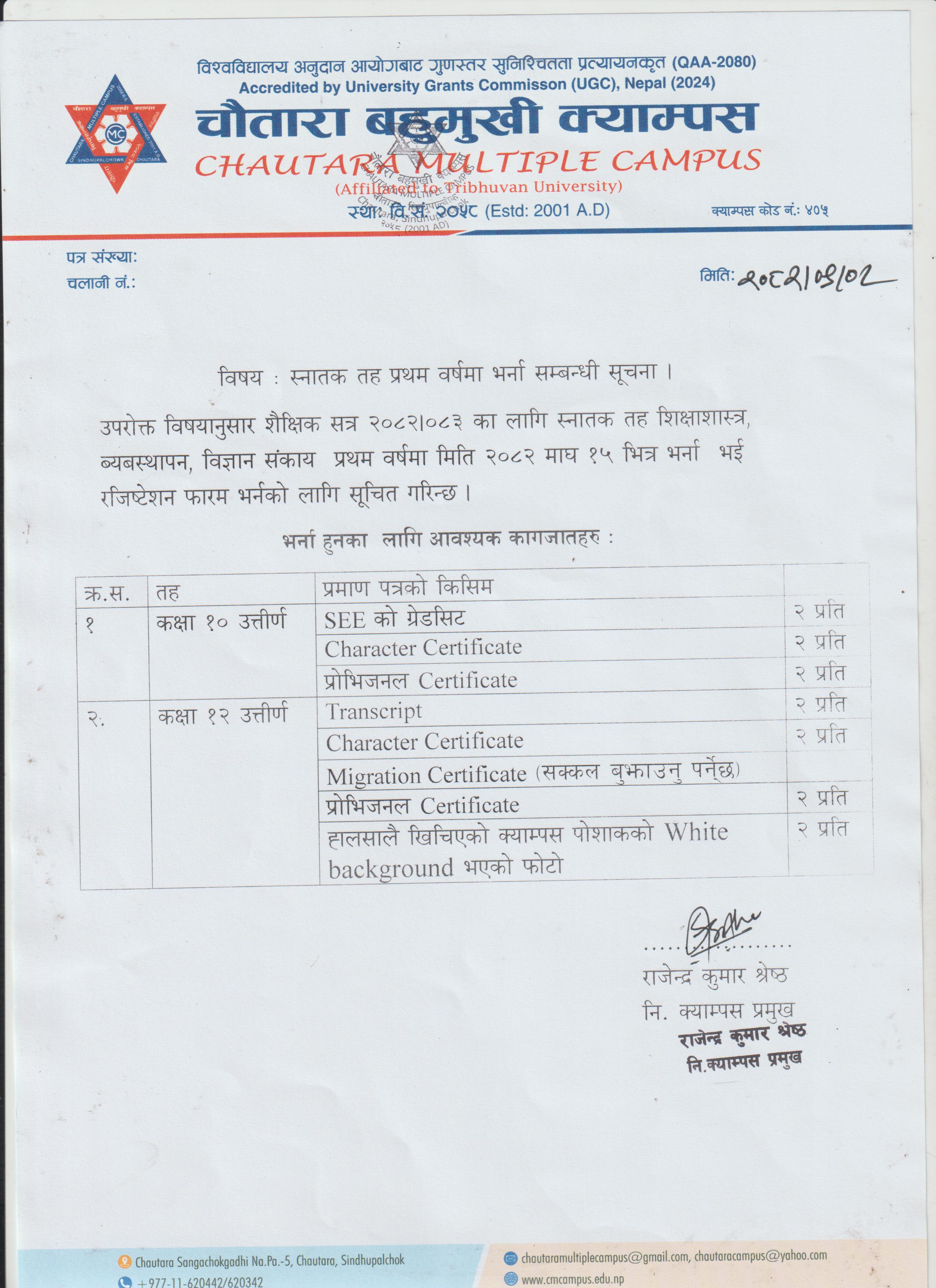 | ४ वर्षे - स्नातक तह वि.ए., वि.वि.एस., वि.एड., वि.एस्सी. वि.एफ.ए. चौथोँ वर्ष -२०८२ को नि |