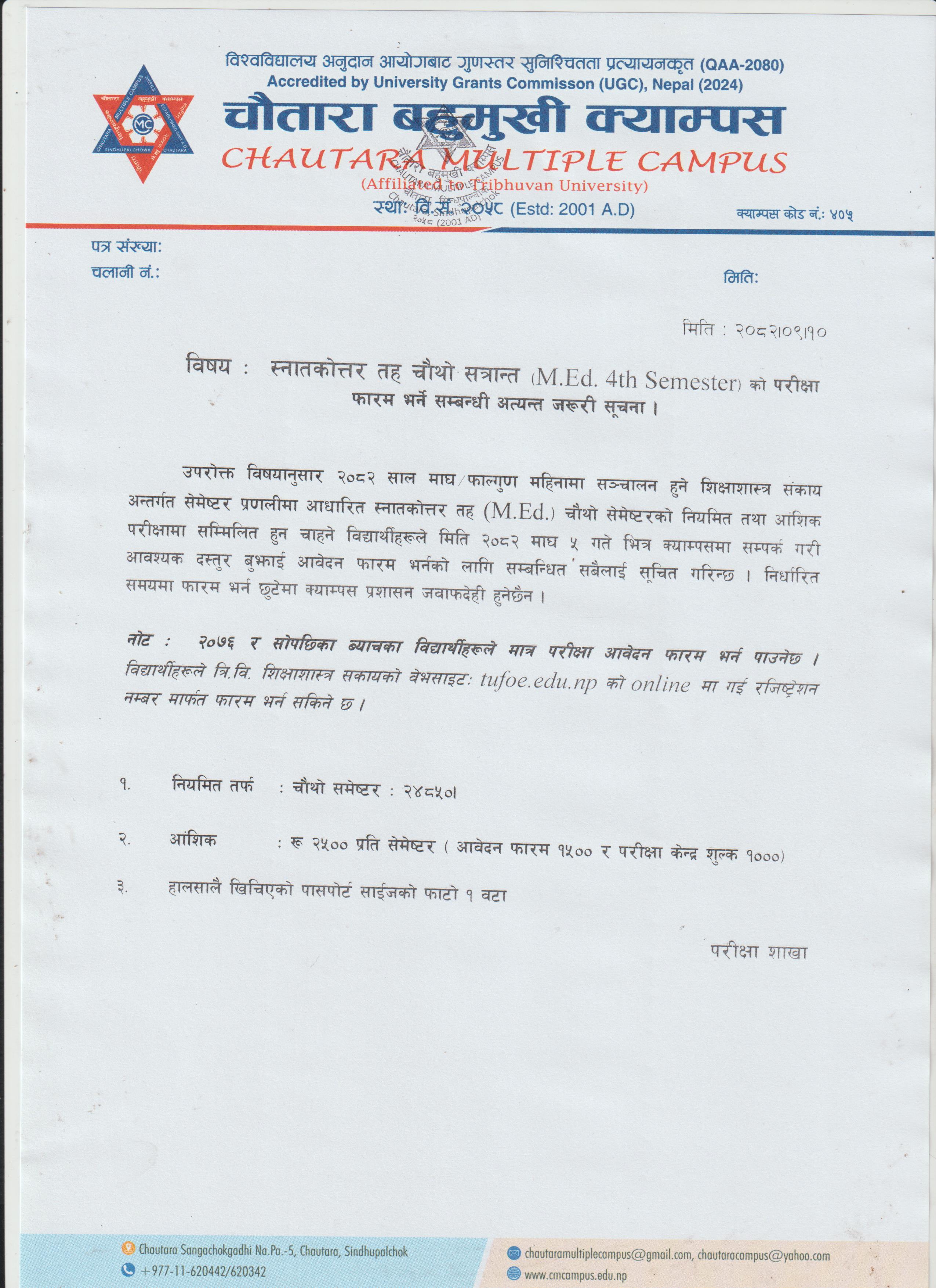 As CMC provides quality education, it is a unique garden of competent teachers. It has been the central attraction of Sindhupalchok and offering miscellaneous programs of Bachelor's Degree including B.B.B., B.Ed., and B.Sc. in the courtyard of Chautara with proper management and eligible faculty members. As the dire need of changing time and stop students' deprivation from higher level education, CMC has further extended its programs and added M.Ed. specializing on English and Nepali from 2075 B.S. with collaborative endeavors. Furthermore, it is a matter of great pride that CMC is the pioneer college of Sindhupalchok to serve Master's program through virtual medium. Undoubtedly, CMC is committed to embracing an inclusive quality assurance education and proudly announces that the courses and services offered by CMC are of the highest quality. It has left no stone unturned to impart excellent education keeping the motto of "Excellence First, Above All".