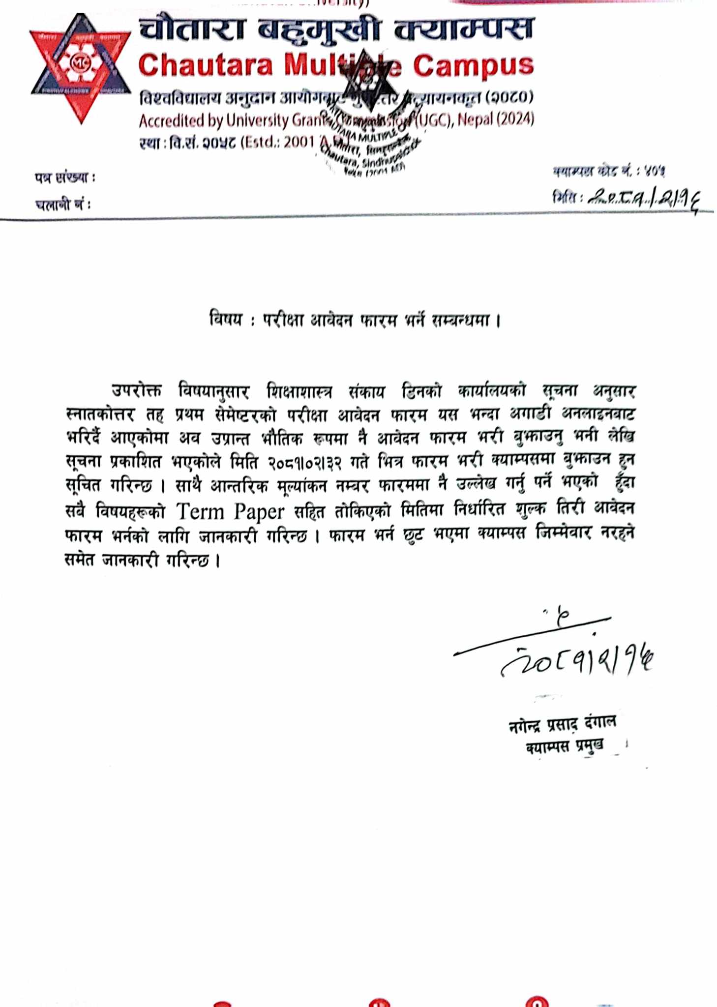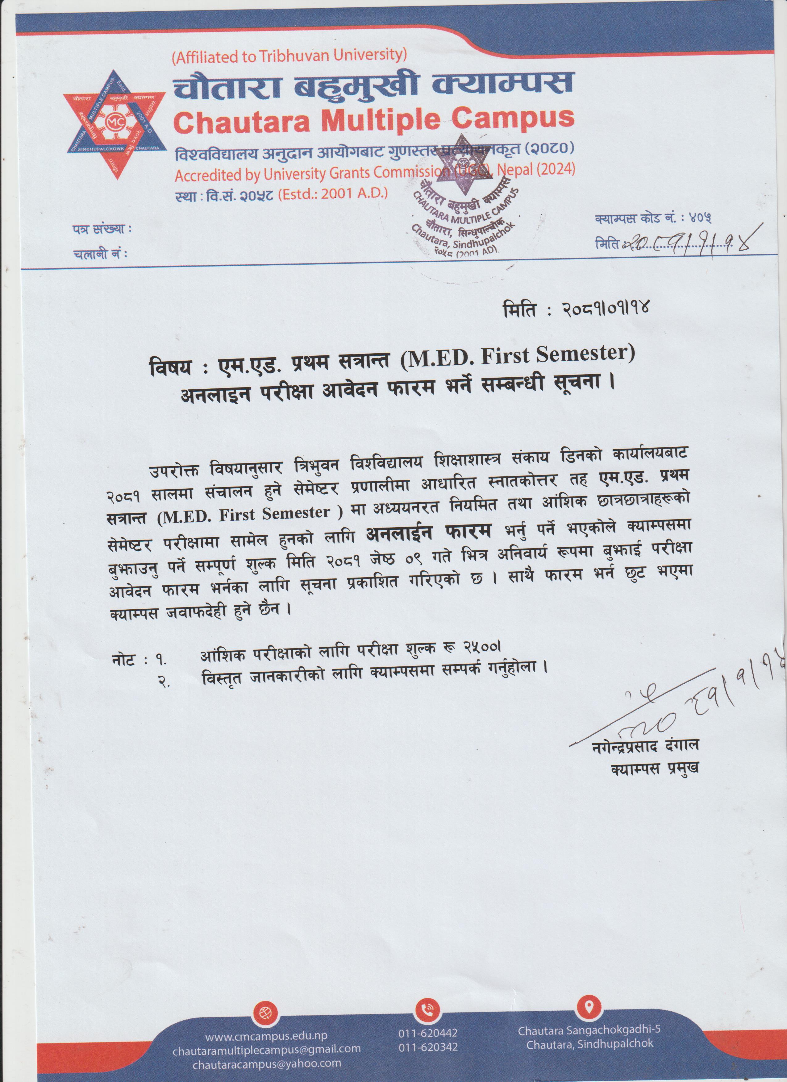 | Notice regarding filling up the exam form for M.Ed./MSSEd. 1st Semester 208 | बैशाख १४, २०८१ शुक्रबार | Download / View |