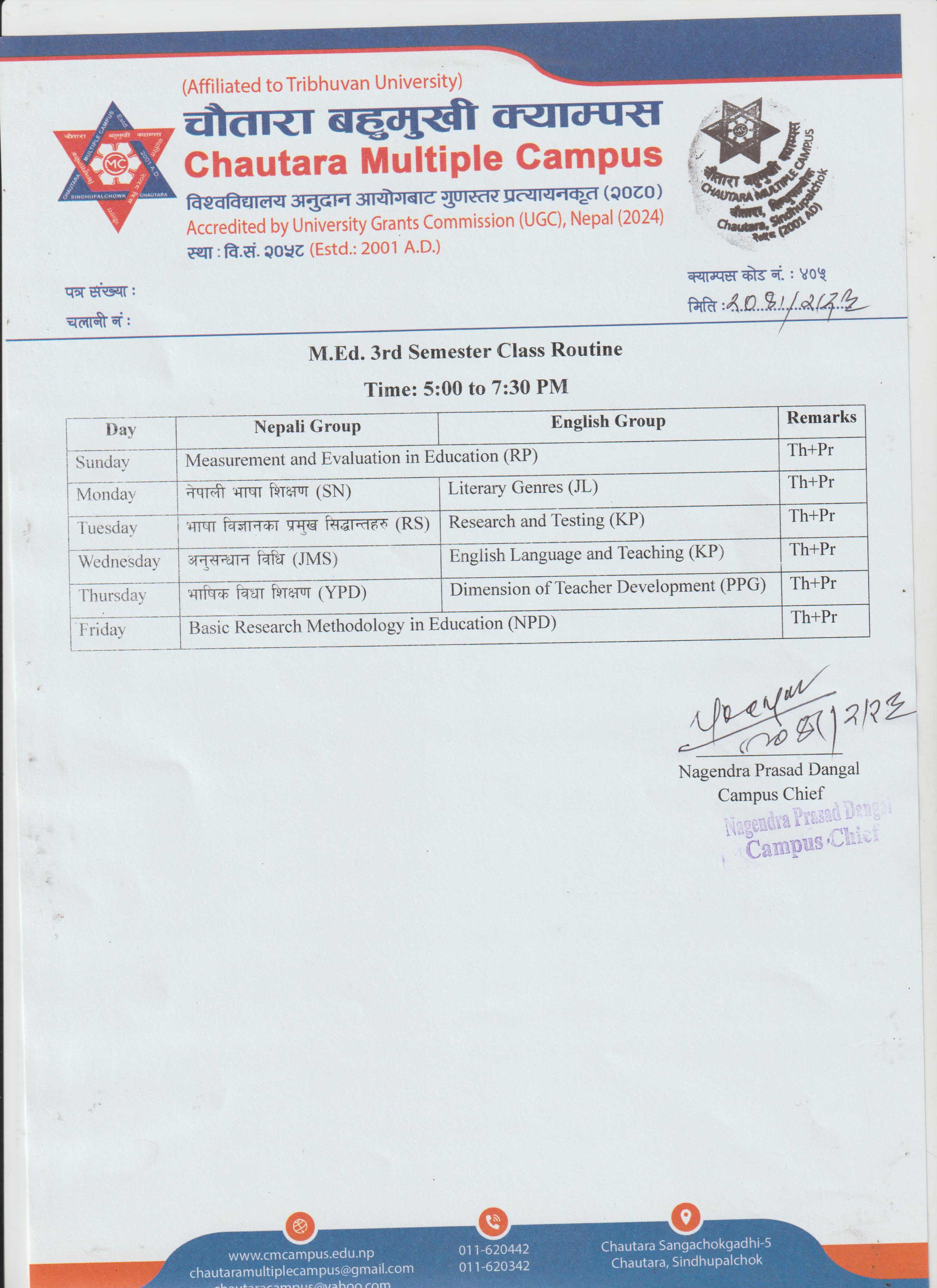 | M.Ed. 3rd Semester Class Routine | जेठ २४, २०८१ बिहीबार | Download / View |