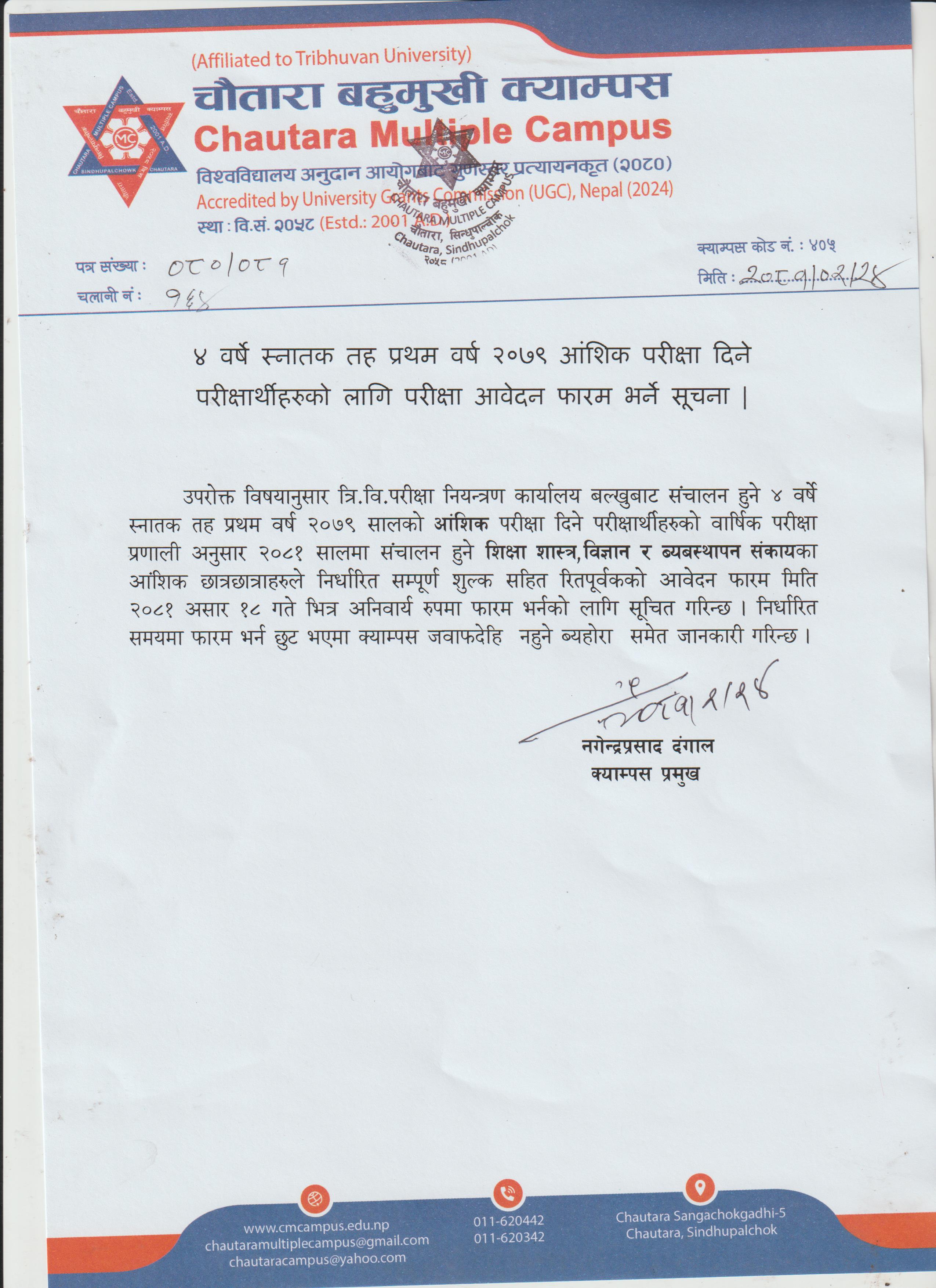 | ४ वर्षे स्नातक तह प्रथम वर्ष २०७९ आंशिक परीक्षा दिने परीक्षार्थीहरुको लागि | जेठ २४, २०८१ बिहीबार | Download / View |