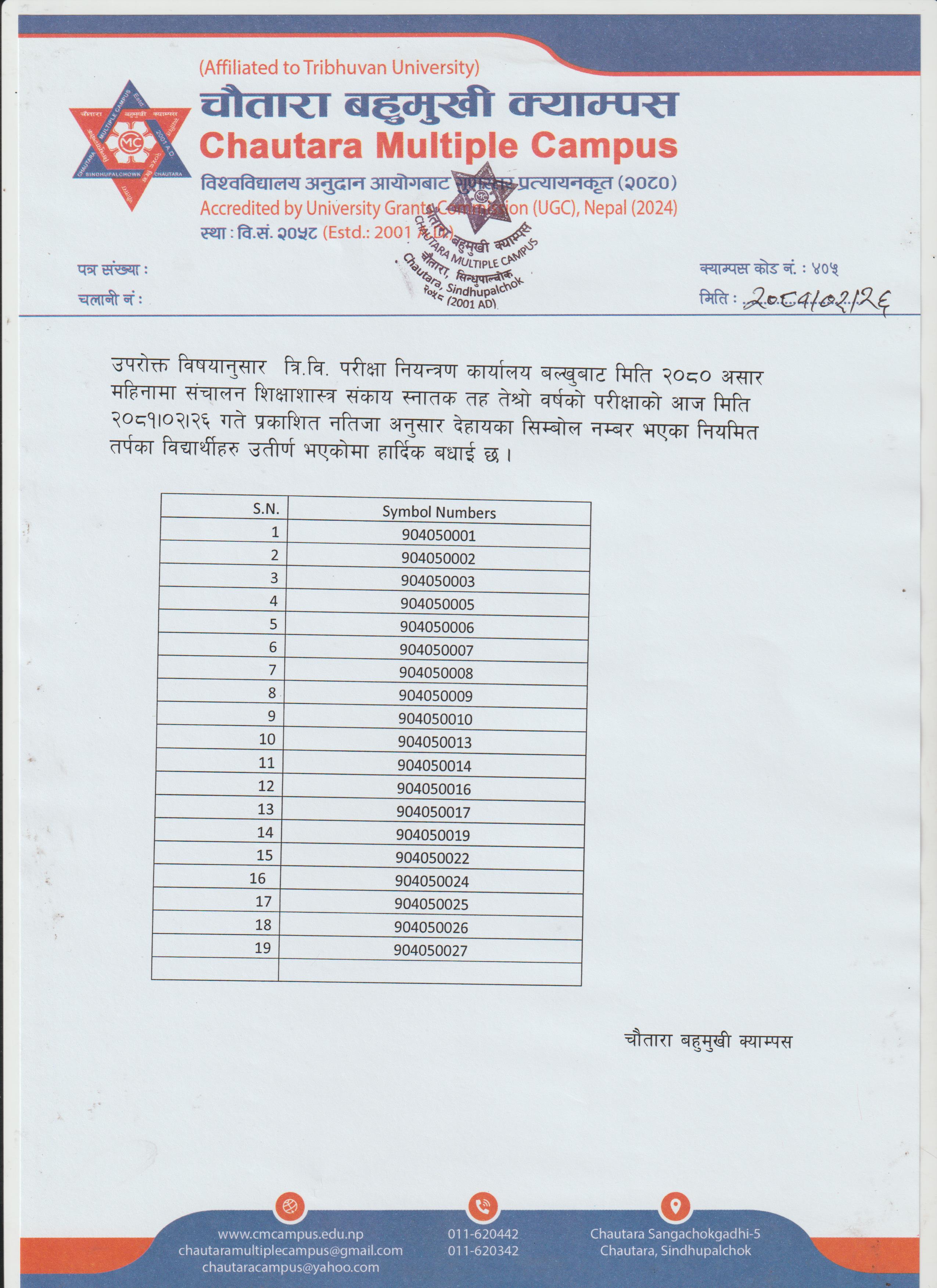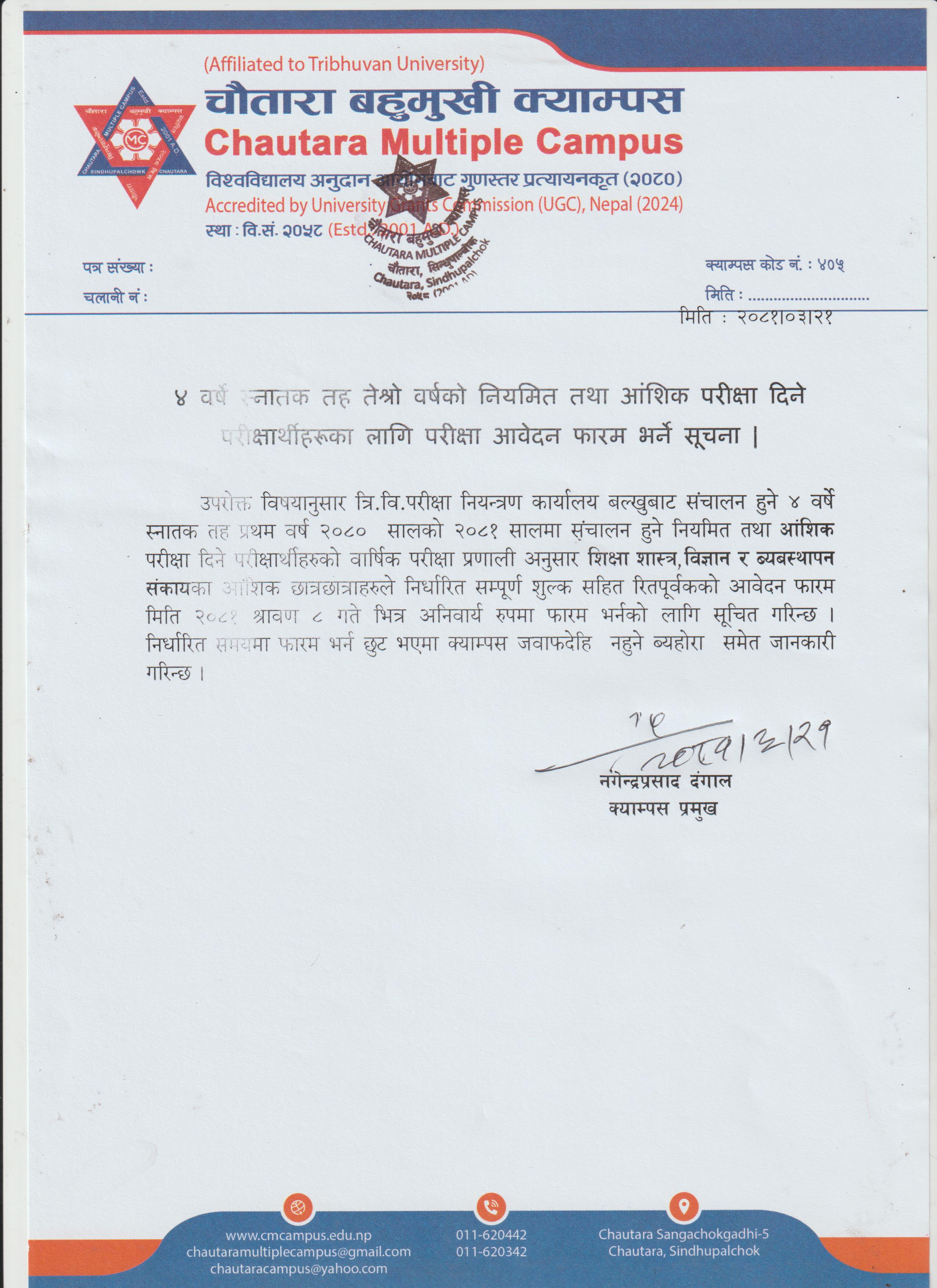 | ४ वर्षे स्नातक तह तेश्रो वर्षको नियमित तथा आंशिक परीक्षा दिने परीक्षार्थीह | असार २४, २०८१ आइतबार | Download / View |