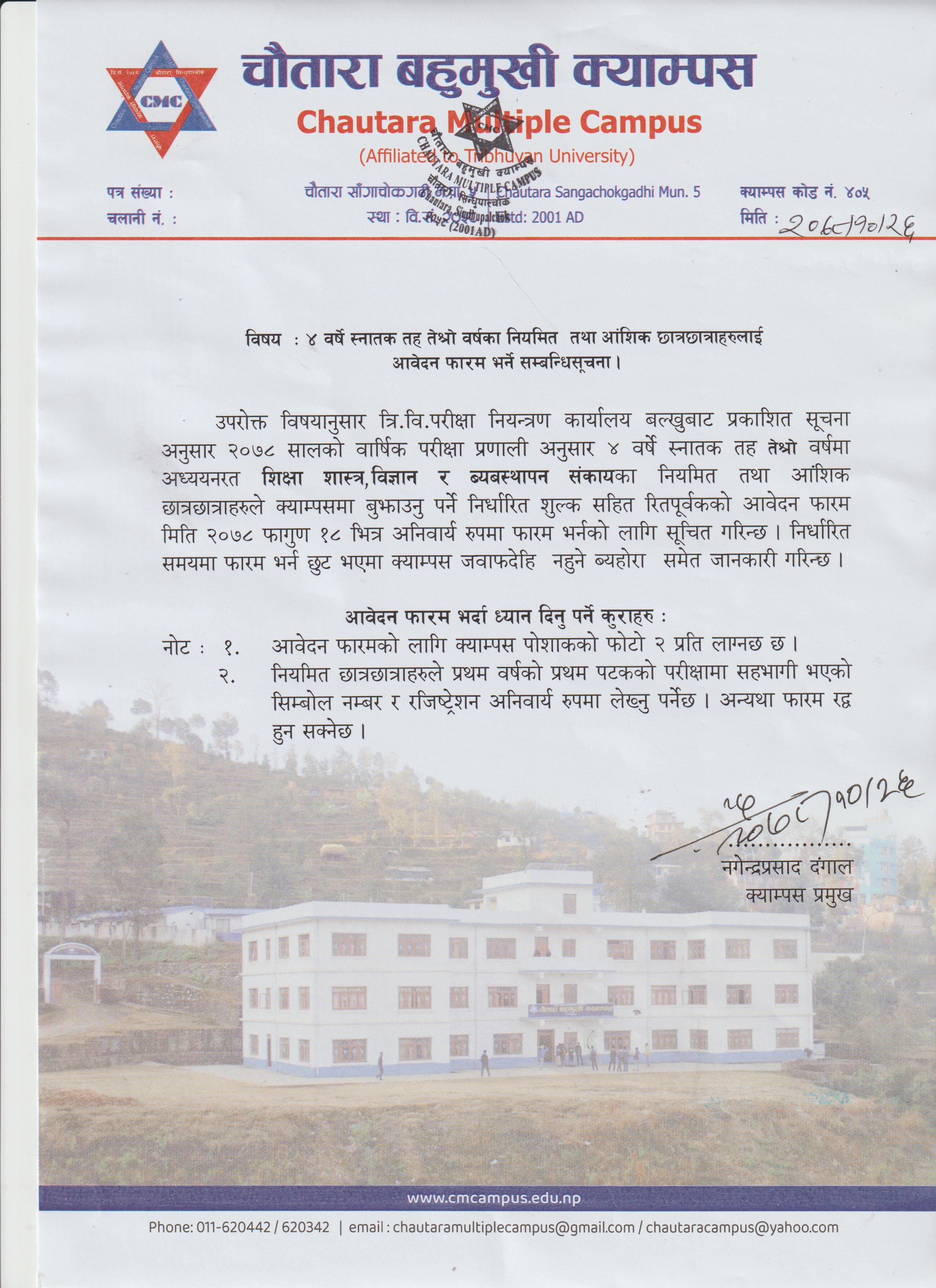 | ४ वर्षे वि.एड/वि.वि.एस/ विएस्सी तृतीय वर्षको परीक्षा आवेदन फारम भर्ने सूचना / | माघ २६, २०७८ बुधवार | Download / View |